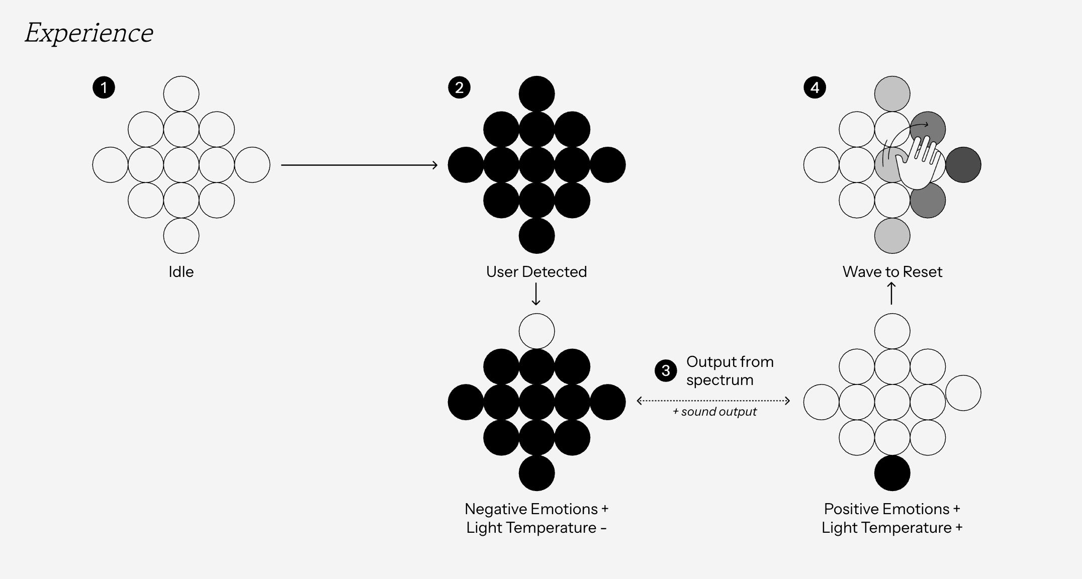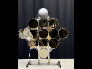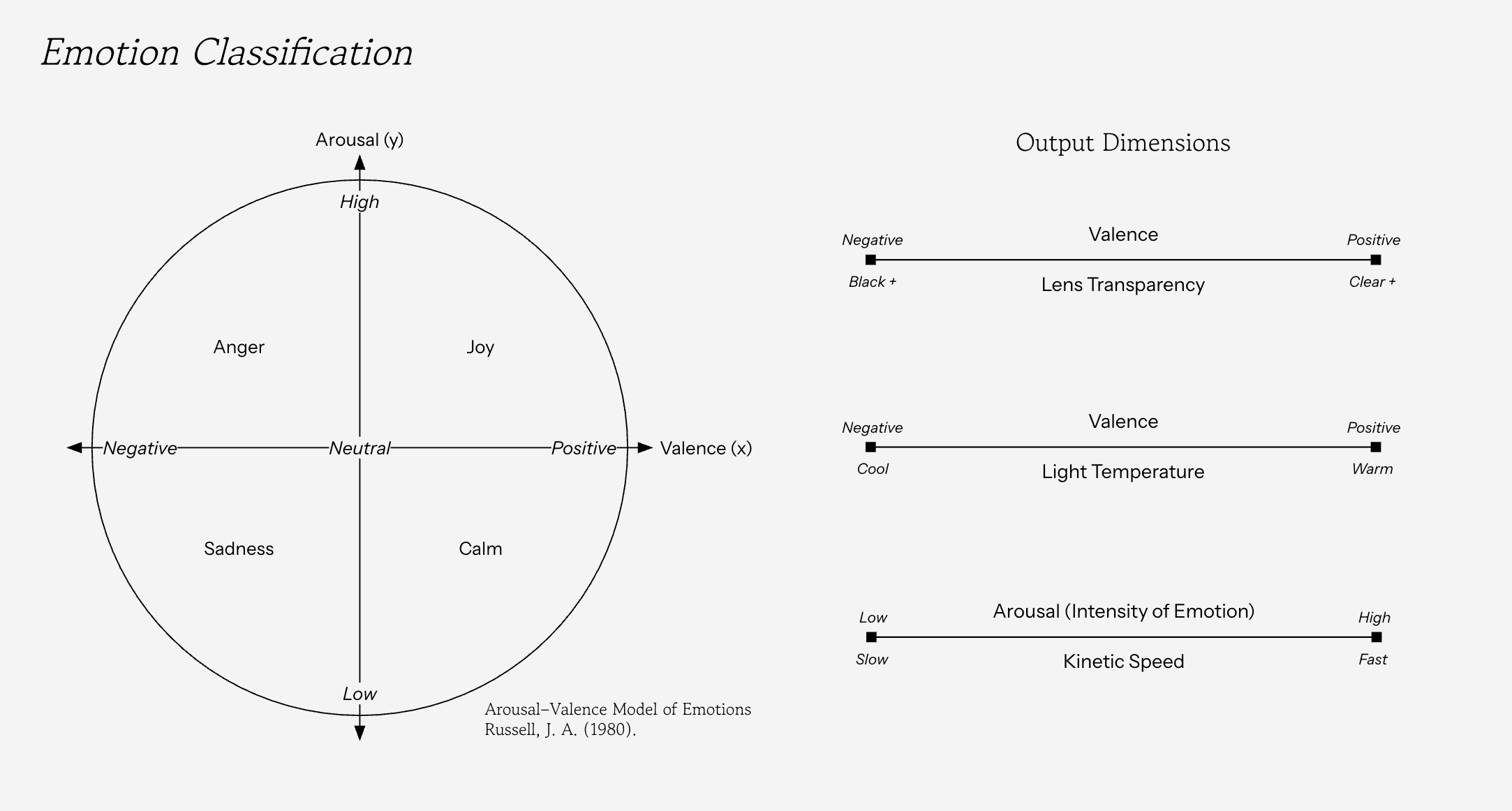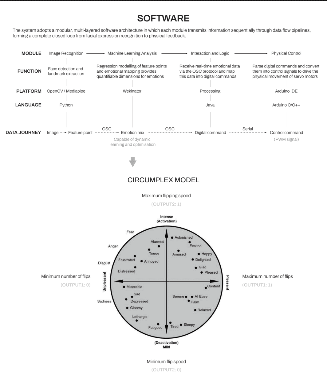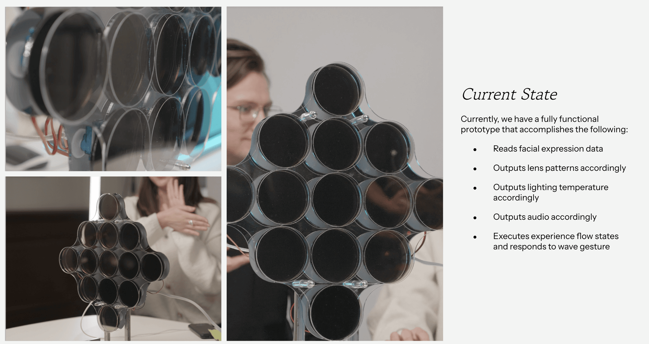 Affective Reflections senses the user’s facial expression and dynamically adjusts a grid of 13 switchable polarizing lenses to reveal or obscure their reflection. Facial data is interpreted using the arousal–valence emotional model: valence (negative → positive) determines how many lenses turn opaque versus transparent, while arousal (low → high) controls the speed of the transitions. Negative, low-valence expressions produce a more obscured reflection; positive, high-valence expressions reveal more of the mirror.A simple hand-wave gesture allows the user to temporarily reset the mirror, clearing all lenses to provide a full, unobstructed view.