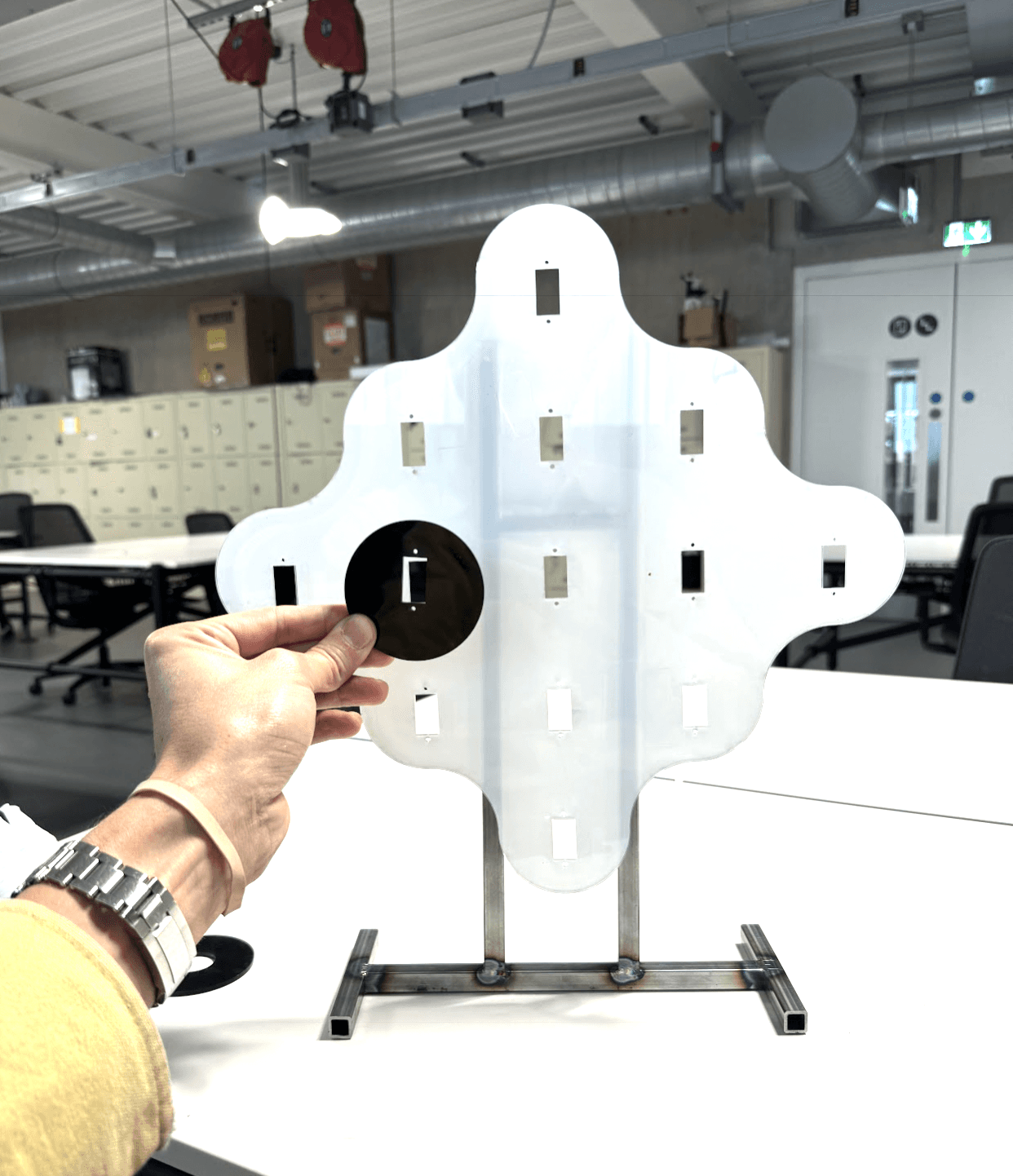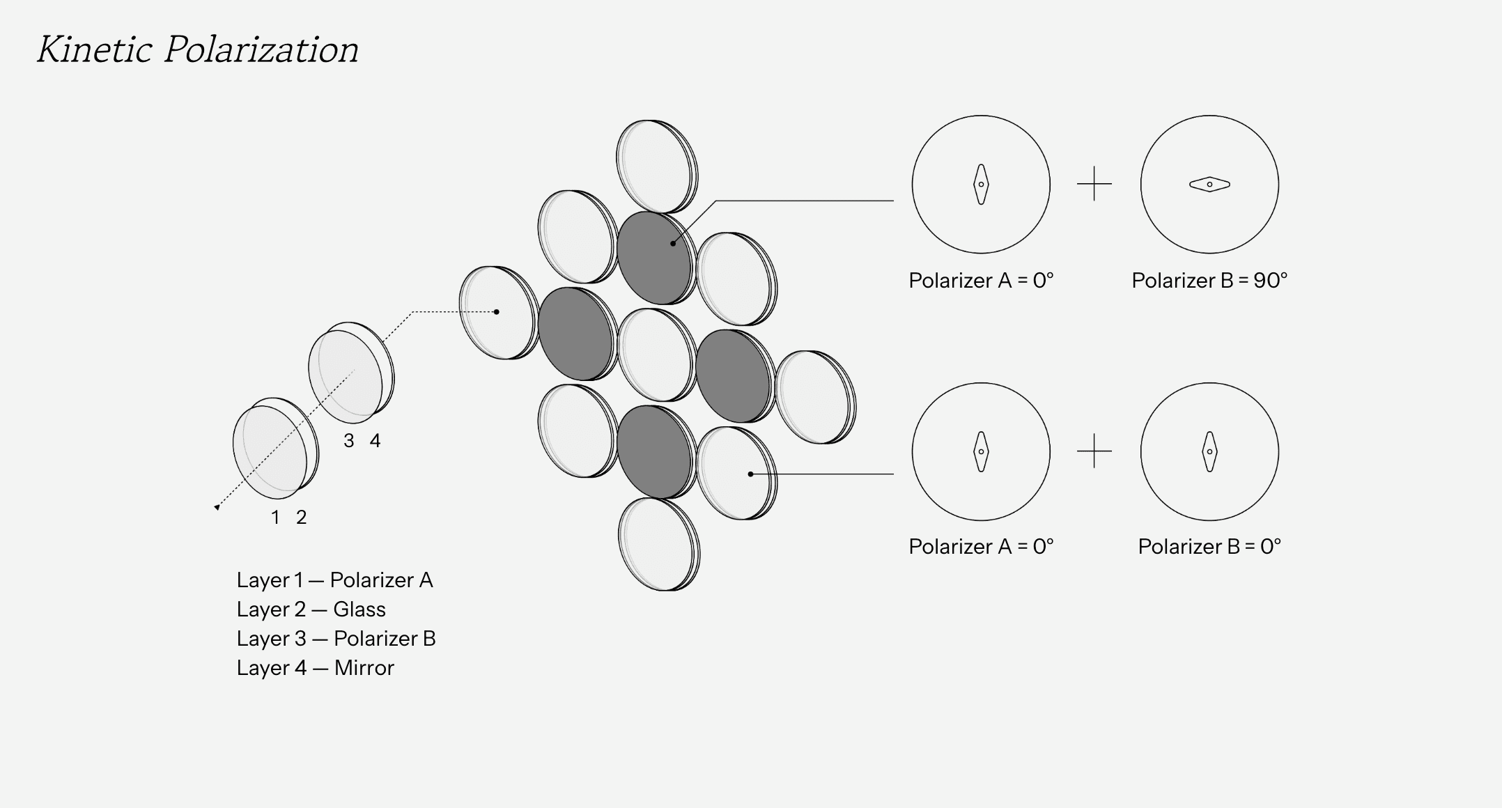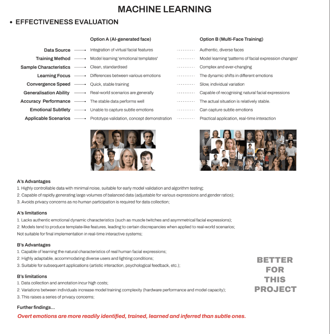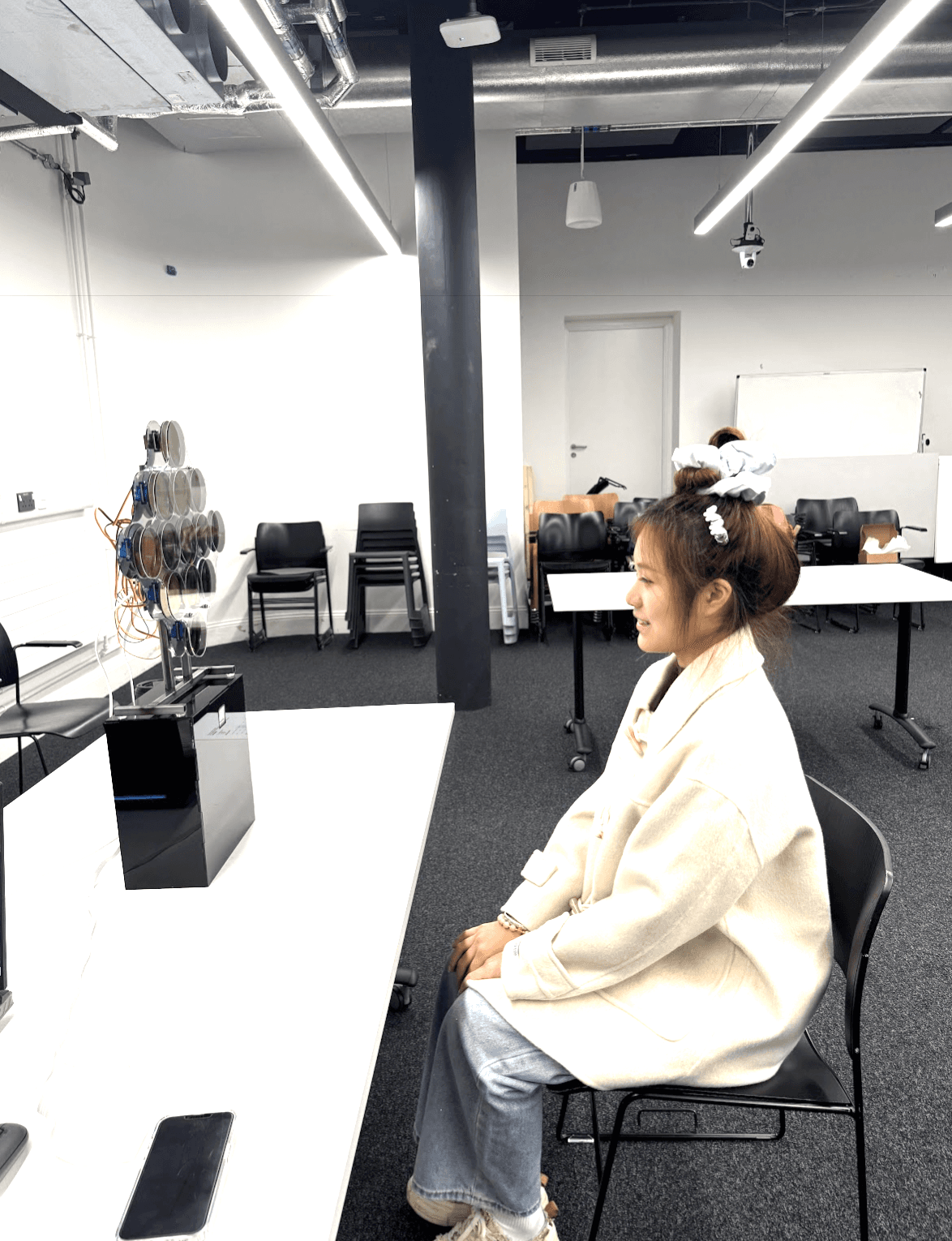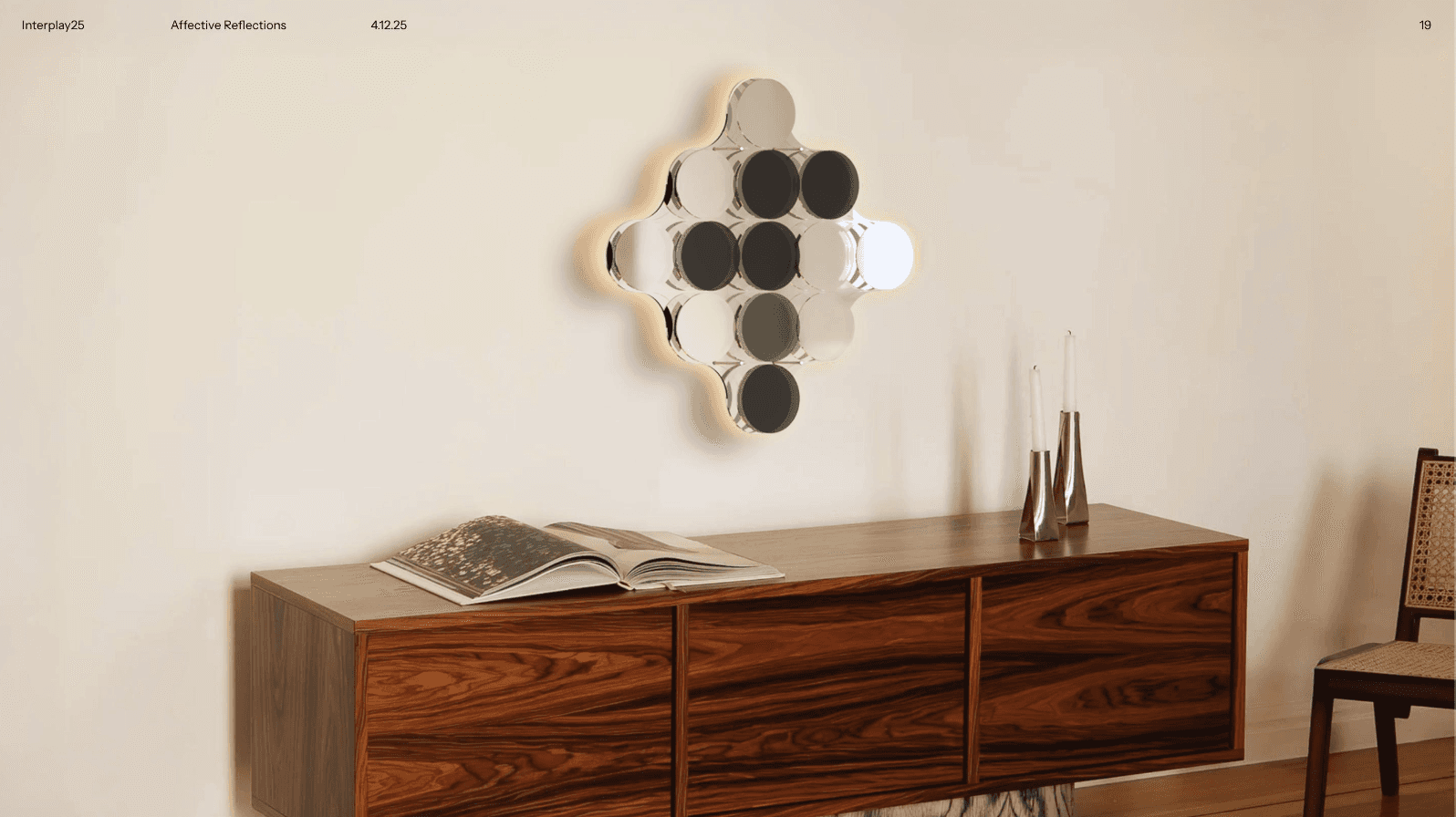 Affective Reflections senses the user’s facial expression and dynamically adjusts a grid of 13 switchable polarizing lenses to reveal or obscure their reflection. Facial data is interpreted using the arousal–valence emotional model: valence (negative → positive) determines how many lenses turn opaque versus transparent, while arousal (low → high) controls the speed of the transitions. Negative, low-valence expressions produce a more obscured reflection; positive, high-valence expressions reveal more of the mirror.A simple hand-wave gesture allows the user to temporarily reset the mirror, clearing all lenses to provide a full, unobstructed view.